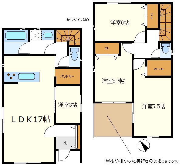 17J+3JLDK リビングイン階段です●制震機能付●屋根の掛かった奥行きのあるバルコニー● |