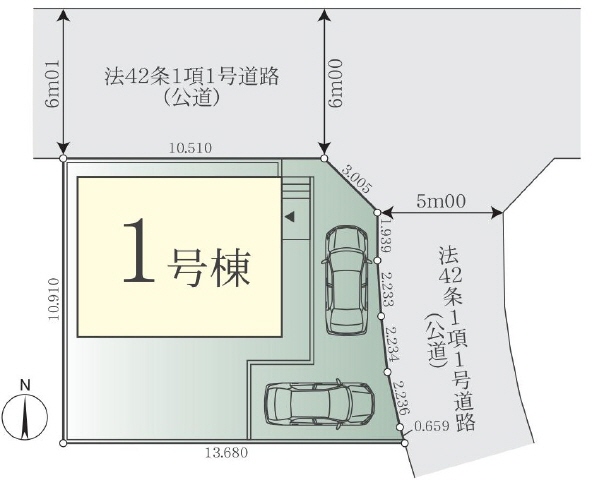 北側道路(公道/幅員6m)に10m接道、東側道路(公道/幅員5m)に8m接道 |