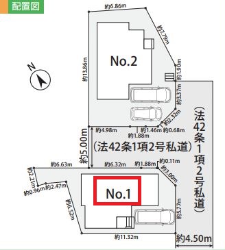 | その他費用 | 接道状況 | 南東側道路(私道/幅員4m)に5m接道、北東側道路(私道/幅員5m)に6m接道 | |