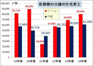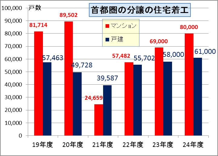 マンションについては24年度は6万9000戸となり、昨年の5万7482戸から19%の大幅の増加しなりました。大型物件が相次いで販売となったためです。