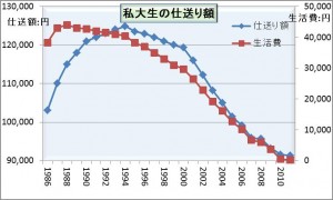 ・2011年の仕送り額の平均は91300円で前年より300円下がって、1986年の調査開始以来の最低になった。