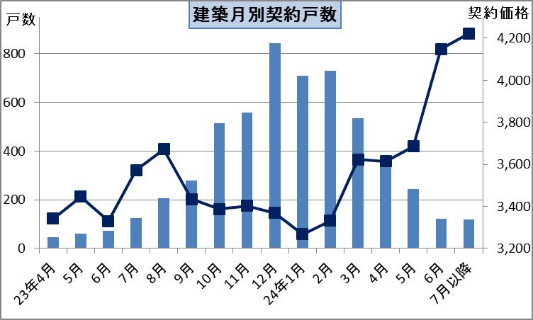 さらに、建築月が6月以降は「青田売り」と言われるもので、まだ建築もされておらず更地での販売のものです。その契約戸数は240戸で契約平均は4185万です。販売平均より581万も高くなっています。「売れる分譲」といえるでしょう。