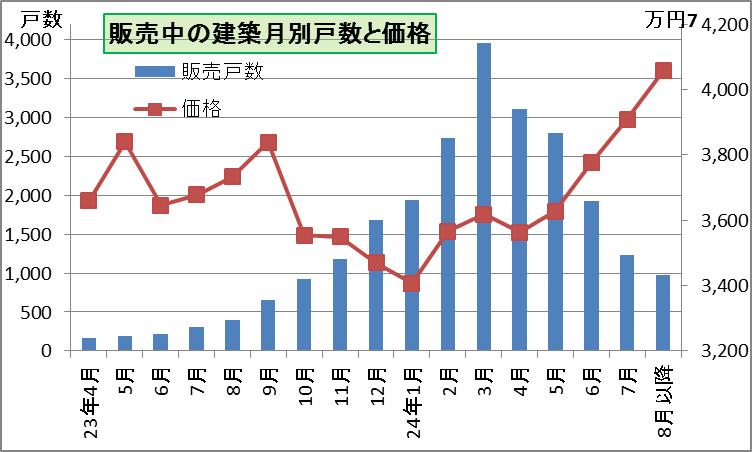 販売中を竣工月別に販売中戸数と平均価格を集計してみました。