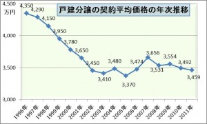 1997年に消費増税されていますが、1997年に4150万であった契約平均が1998年は3950万になり200万も下がっています。この時は3%から5%ですから4150万×2%=90万で、建物のみの課税ですから半分とすると45万上がらないといけないところ、逆に200万も下がっています。