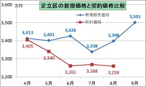 新規販売価格は4月に3413万をつけたあと7月には下がりましたが、9月には3501万と3500万を超えるなど上昇傾向にあります。基本的には施工費の上昇が要因ですが、土地の取得価格が上がったというか震災以前相場に戻っているというのが要因です。