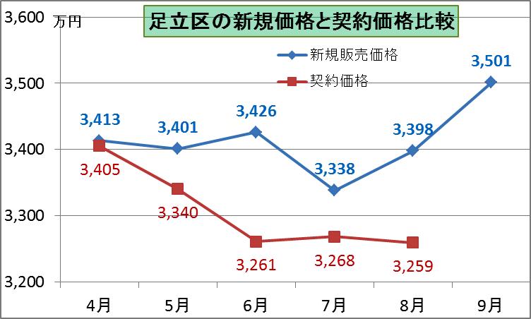 新築一戸建て分譲の足立区の契約平均が下がっていて、販売価格とのギャップが出ています。