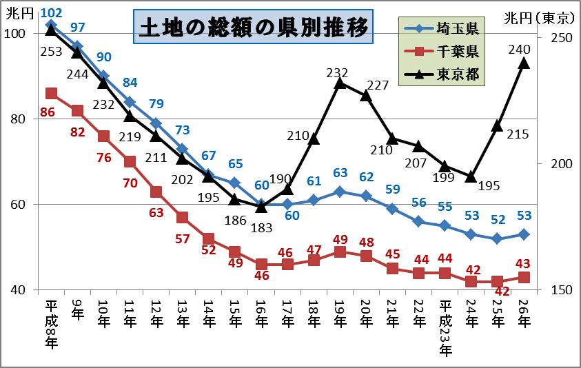 首都圏で埼玉県と千葉県はミニ住宅バブルの時に3兆円・+5%と少しあがりましたが東京の+39兆円・+26%上げたのに比べると小さいです。