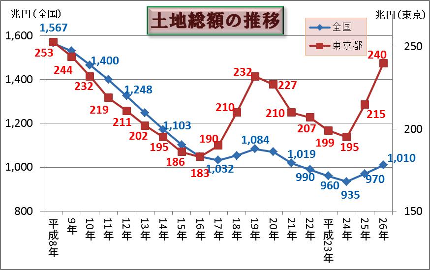 バブル崩壊以降の土地の下げは全国で平成17年の1032兆円が底となりました。