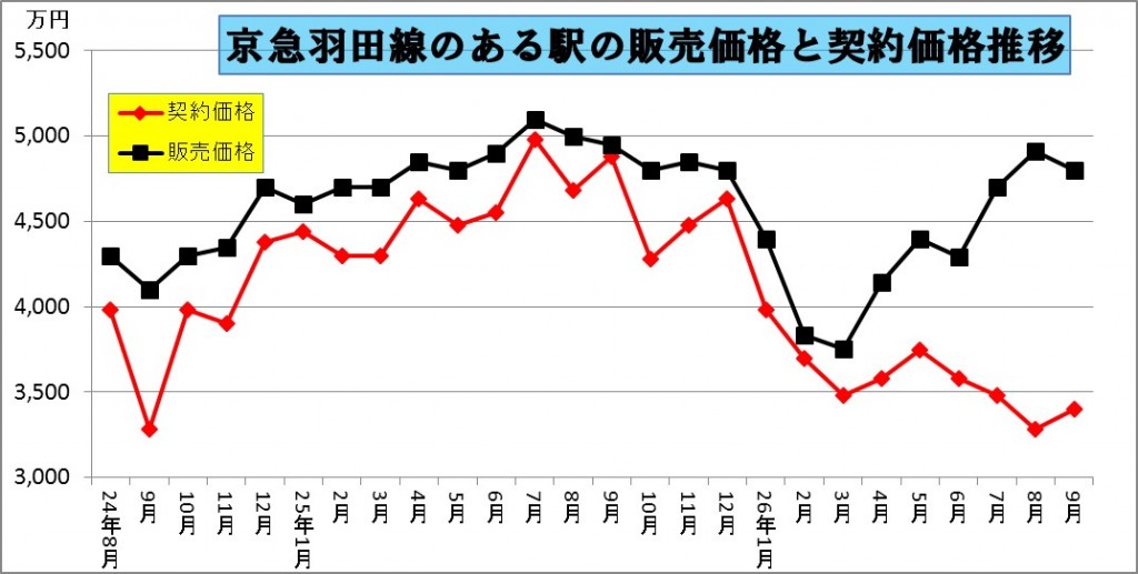 そのために新築一戸建ての新規販売価格と契約価格のかい離がおきています。特に低年収層の多いエリアは顕著です。その一つである京急羽田線沿線をみてみると