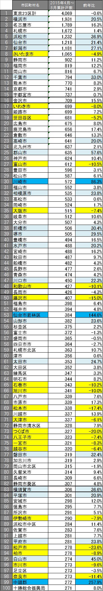 住宅着工の持家の行政別の2015年4月から9月の累計戸数のベスト100を表にしてみました。