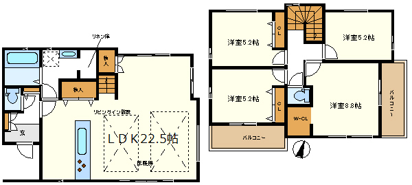 洋室5.2・洋室5.2・洋室5.2・洋室8.8・LDK22.5 |