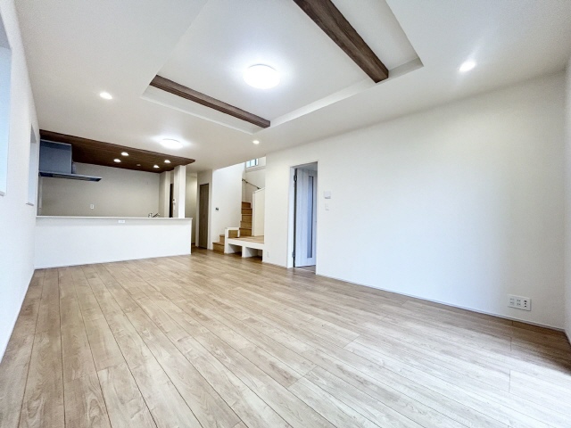 21.5JLDK リビングイン階段です。折上天井、ポップアップ天井、主賓室勾配天井など立体的設計。LDK1部シャッター付■ソーラー10年間 5,400円/月■ |