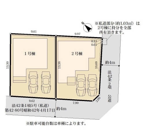 南西側道路(私道/幅員4m)に9m接道 |