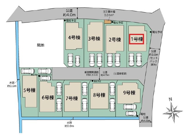 南側道路(公道/幅員4m)に5m接道、北側道路(公道/幅員3m)に5m接道、側道路 |