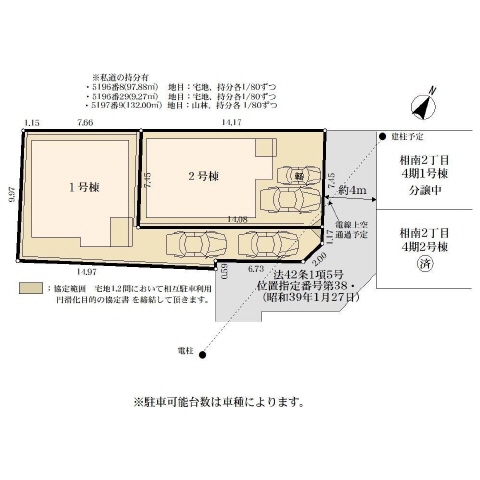 東側道路(私道/幅員4m)に3m接道、南側道路(私道/幅員4m)に6m接道 |