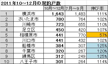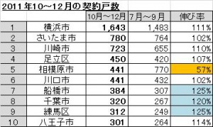 アトラクターズラボの戸建分譲データベースを松沢が分析した結果、2011年10月~12月の契約戸数で一番多かった市は横浜市でした。