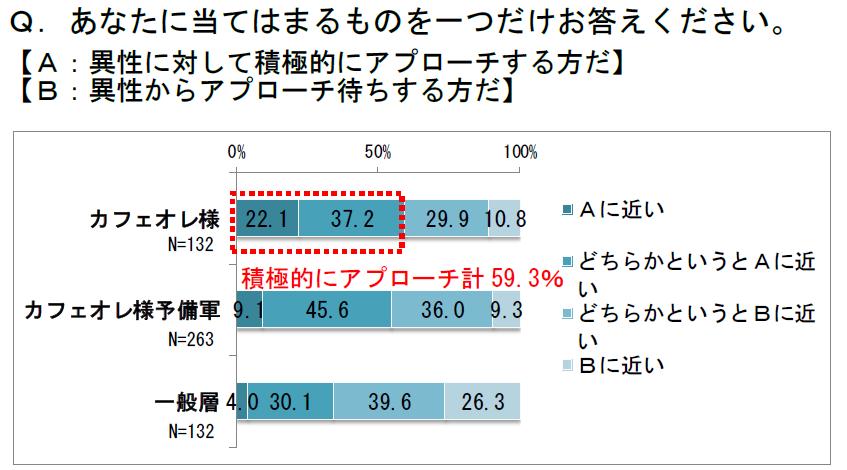 「異性に対して積極的にアプローチする方だ」が22.1%と一般層の4.0%の5倍という積極さです。