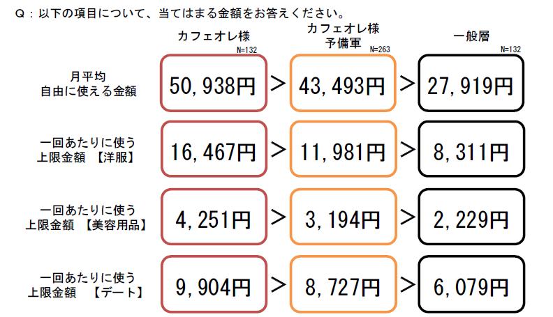 「ヘアワックス・スプレー」など「カフェオレ様」層が69.1%で一般層が24.9%と3倍近いものや、「化粧水」が68%と19.9%、「フレグランス」57.4%と16.1%と、男性があまり使わない美容アイテムを使用している。