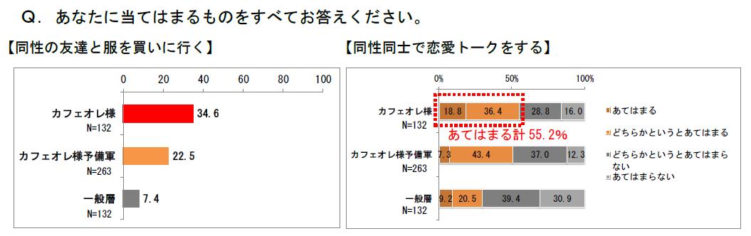 「男の友達と服を買いに行く」が34.6%で、一般層7.4%に比べて5倍近い回答率という際立ったもので、「男同士で恋愛トークする」が55.2%で一般層29.7%の倍近くとなっています。