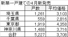 新築一戸建ての4月の新規販売は首都圏合計で5227戸で平均価格3708万でした。