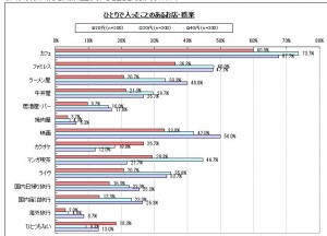 一番・二番は順当としても、フアミレスが意外と上位で30代・4代女性の約半数が一人で行ったことがあるようです。仕事の最中の立ち寄り昼食かなにかでしょうか。