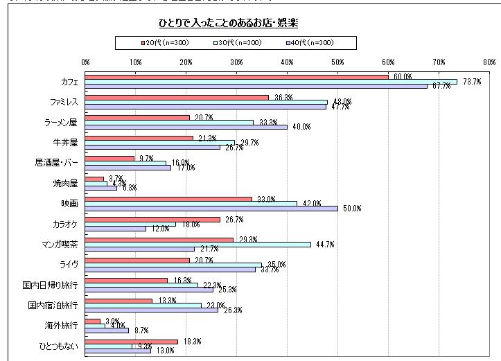 そうみると、一人で行きやすいなじみのあるものは、20代がカラオケで、30代はマンガ喫茶で、40代は映画のようです。