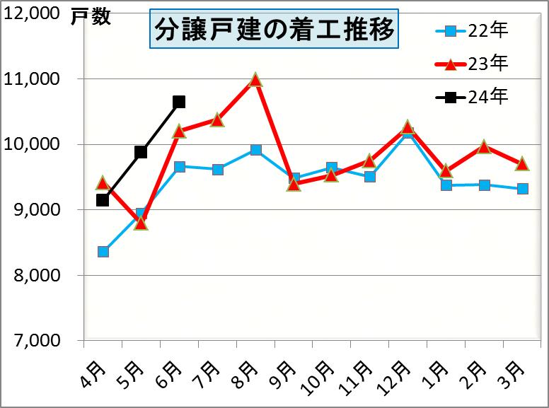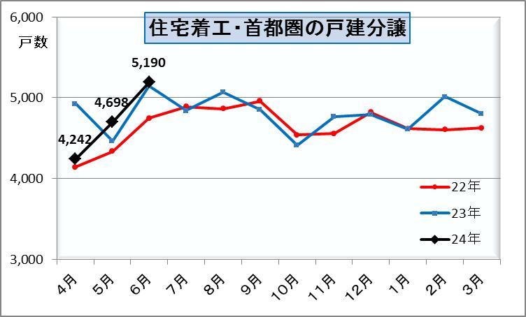 平成24年6月の住宅着工は前年同月比▲0.2%。新築一戸建て分譲は+4.4%と増えた。