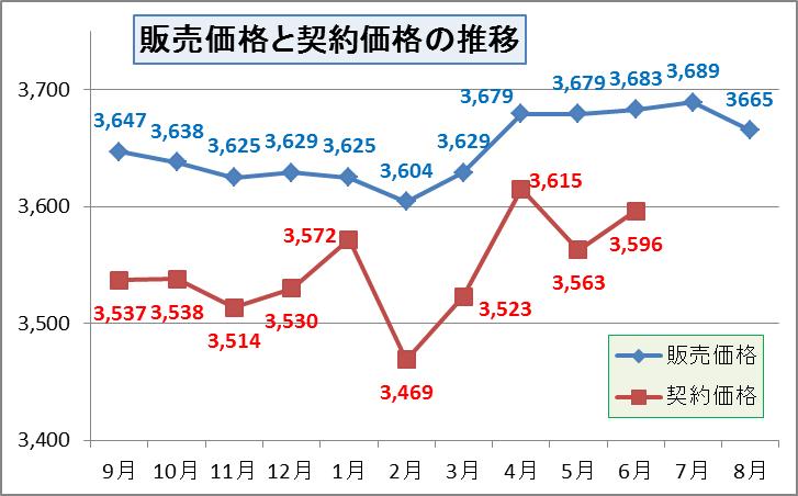 4月以降はほとんど3680万前後で安定推移しました。それが8月になり24万下がり3665万と下がりました。在庫が増えてきて、値引きが出てきたためです。