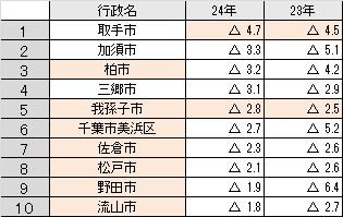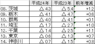茨城県取手市が前年比▼4.7%となっていますが、下位10のうち7地点が千葉県となっています。また我孫子市は前年下落幅を拡大しており、震災の影響が続いているといえます。