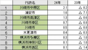 上昇率のトップは川崎市中原区になり、その後トップ5のうち4つが川崎市となっていて、その下に横浜市が3地点となり人気となっています。