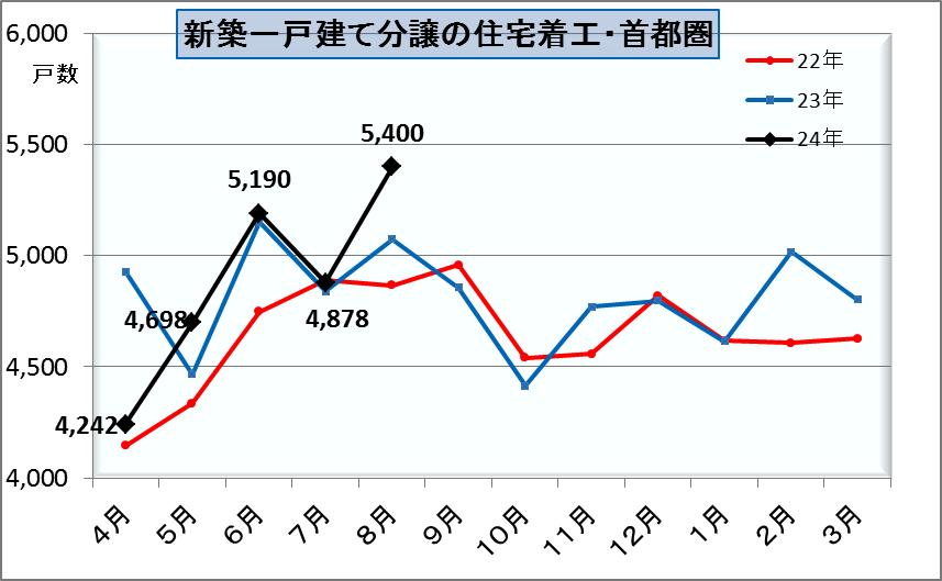 新築一戸建ての住宅着工の首都圏の8月は5400戸で前年比+6.4%と増えました。