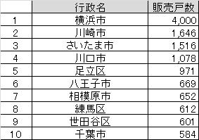 行政別に販売された戸数のトップ10をみると、一番は横浜市です。
