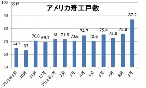 アメリカの商務省が2012年9月の住宅着工を発表しましたが、季節調整の年換算で87万2000戸となり、2008年7月以来の多さでリーマンショック後で最高となりました。