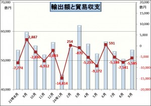 特に中国は輸出としては最大額の国となっていたので減少額が大きくなっています。尖閣問題による日本製品不買運動によるものなどですが、それが始まったのが9月15日以降なので、影響は月の半分なので10月はさらに落ちると思えます。