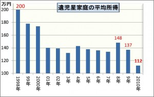 あしなが育英会に高校進学奨学金を申請して母子家庭の平均所得が112万円であったそうで、調査開始した1998年以来最低となったのみならず、1998年の平均200年の半分近くまで落ち込んでしまっている現状が浮き彫りになりました。