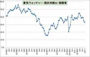 首都圏の南関東は32.9ポイントで前月より▼1.9ポイント下がりました。また、この32.9ポイントは全国最低に落ちました。主には家電店の不振が大きく、外食の不振などが響いている。