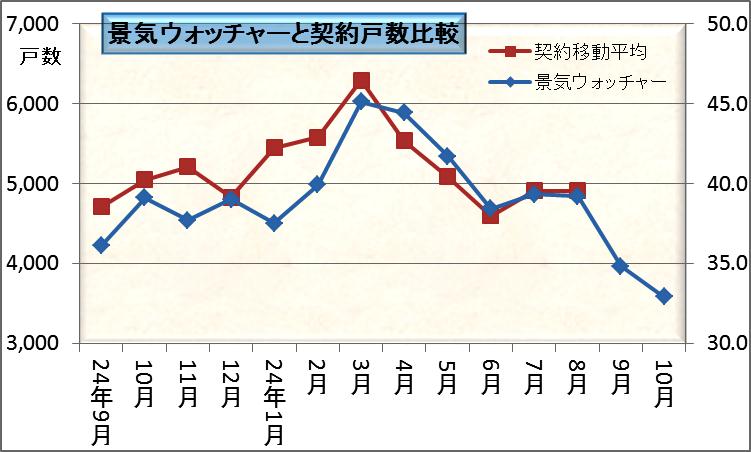 また、景気ウォッチャーと新築一戸建ての契約とは「強い相関関係にある」のでその比較をみてみると