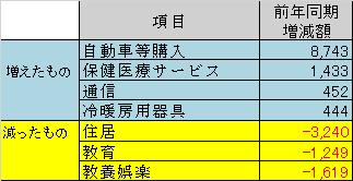そのほかで増えたもので「通信費」452円でスマホによる通信費の増大の結果で、「冷暖房用器具」は省エネ用への買い替えの結果です。