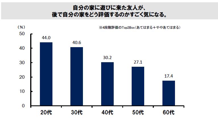 「自分の家に遊びに来た友人が、後で自分の家をどう評価するか気になる」という質問に対して、60代は17.4%であるのに、20代は44%と高くなっています。