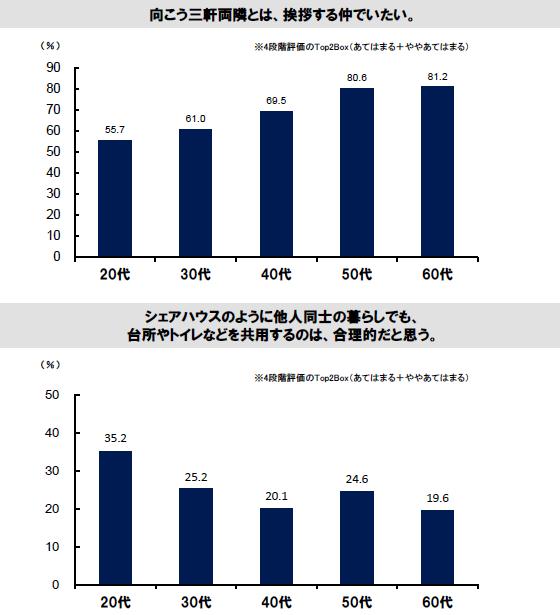 50代以上は台所・トイレを共有化する住宅は「貧しいアパート」という記憶がありますが、20代にとっては「新しい住宅形態」と映っていることがあります。そのために、回答率が「近隣コミュニケーション」に対する考え方というより、「新しい住み方」という回答になってしまったために、逆の回答率となったと思えます。