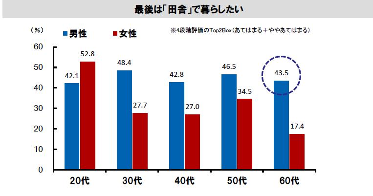 これは、日常の買い物や病院などの利便性が下がると大変であるという主婦としての感覚と、男性は友人関係が会社が終わると断ち切られて近隣にもおらず、近隣も田舎も関係ないのですが、女性は近隣で友達がいますので、田舎に帰るといなくなってしまうということがあります。