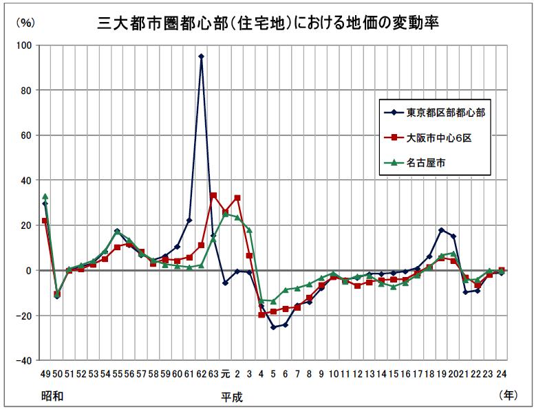 東京都区中心部は、昭和61年のバブルにより大きく上昇し、その後平成元年より下落に転じて15年まで下落を続けました。それが17年には上昇に復活して20年まで上昇が続きました。それが平成21年のリーマンショックにより急遽下落してしまいました。それが24年にはようやく底打ちをしています。