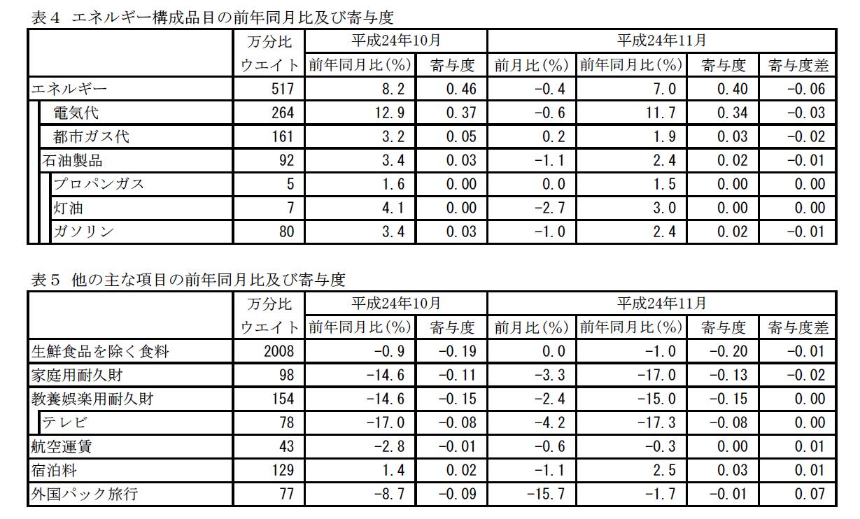 平成24年11月の東京都区部の総合指数は-0.4%となり、8月から10月のプラスから一転してマイナスになってしまいました。