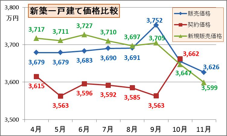 新築一戸建ての新規販売平均価格は6月に3727万と今年の最高値となった後は緩やかに下降して9月に3709万となりました。そこから10月には58万下がり、11月は48万下がりましたので10月・11月の2ケ月で100万下がりました。これは埼玉県の新規販売が増えて、3000万円以下の物件が多かったために価格が下がりました。
