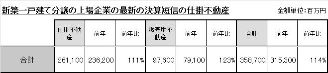 新築一戸建て主体の上場企業の決算短信の中の「仕掛不動産」は今後販売するための用地仕入れを主に表します。その7社合計は2611億円あり前年同期比で111%となっていて、これらが今後販売されてきますので、+11%の販売増とる見込みです。