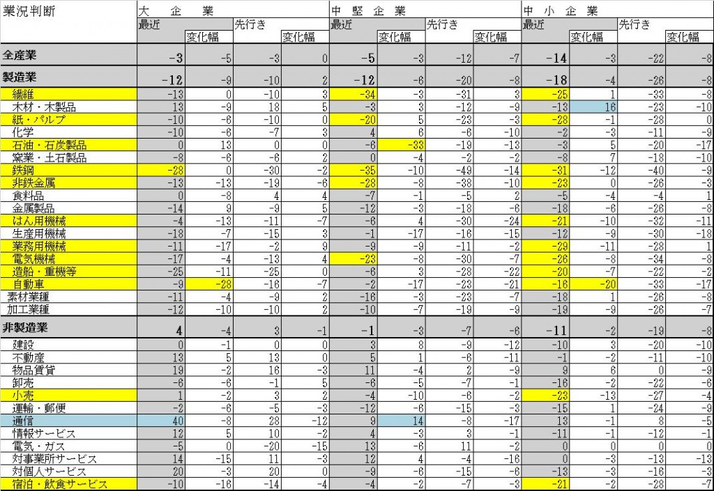 前回調査よりプラスなのは通信と木材・木製品のみです。通信はスマホ拡大とiphone人気によるもので、木材は住宅着工が復興需要と消費税駆け込み着工により増えているためです。