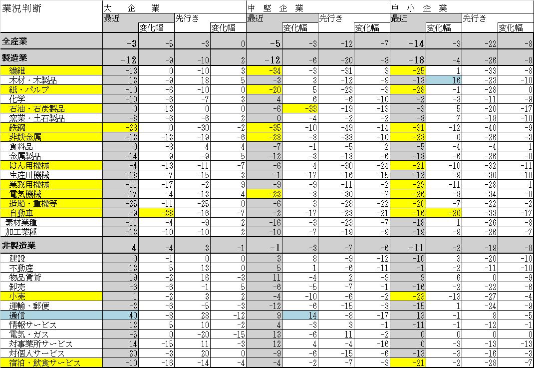 その影響もあり、最もマイナスが大きいのが「鉄鋼」になっています。大企業でマイナス28で中堅企業でマイナス35で中小企業でマイナス31と規模を問わずマイナス30前後とかなり業績が悪くなっています。