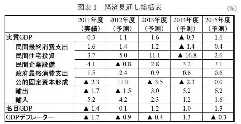 実質GDPの2011年度はは0.3%でしたが、2012年度は1.1%と予測していて、2013年度し1.6%と伸びる見込みです。