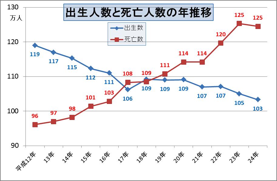 そして死亡数は平成23年が東日本大震災の影響で125万3066人と過去最大となりましたが、今年はやや減り124万5000人となりましたが、毎年3~5万人前後増えている傾向にあります。