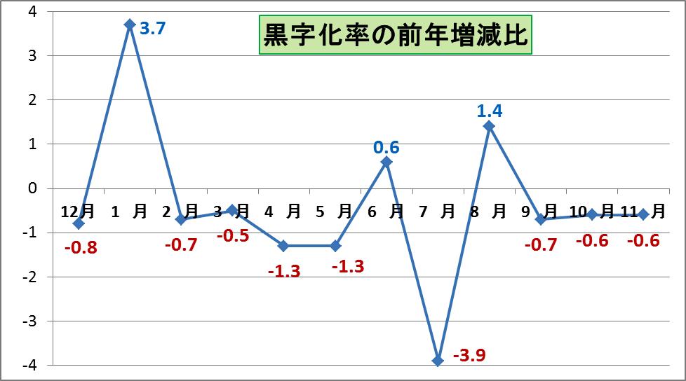 この聖域と言われた教育費まで削るほど苦しいということですが、「黒字率」は11月が15.3%で前年同月より▼0.6%下がりました。